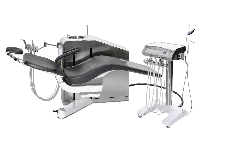 Bestückung Arztgerät: Bürstenlose LED-Mikromotor(en) 300 – 40.000 rpm, LED-Turbineneinrichtung(en), 6-F oder 3-F Spritze, Piezo Scaler mit LED, Implantologiemodul.